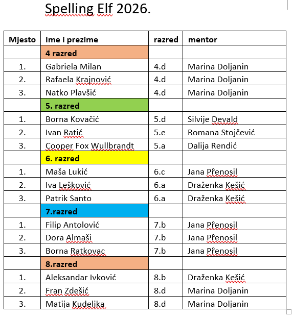 I ove školske godine učenici i mentori naše škole sudjeluju u, sada već tradicionalnom, natjecanju u sricanju na engleskom jeziku. Slična natjecanja pod nazivom Spelling Bee vrlo su popularna u SAD-u a naše natjecanje Spelling Elf naziv je dobilo prema patuljcima, pomoćnicima Djeda Božićnjaka jer su se prvih godina natjecanja održavala u vrijeme Božića. Interes za ovo natjecanje je uvijek velik, pa se i ove godine prijavilo 49 učenika od četvrtog do osmog razreda. Simbolične nagrade dobili su učenici koji su osvojili prva tri mjesta u svakoj kategoriji, a oni su se ujedno i plasirali na županijsku razinu. Natjecanje županijske razine održati će se u ponedjeljak 27. travnja 2026. u I osnovnoj školi u Bjelovaru.