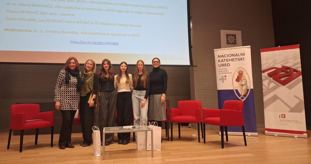U četvrtak, 8. siječnja 2026., učenice Vivien Holubek i Lena Sestrić iz OŠ Vladimira Nazora Daruvar, zajedno s vjeroučiteljicom i Erasmus koordinatoricom Tihanom Petković, sudjelovale su na panelu u sklopu Katehetske zimske škole pod nazivom: „Budućnost zahtijeva da naučimo više surađivati i rasti zajedno“ (Lav XIV.).  Tema panela bila je Erasmus akreditacije i iskustva sudjelovanja u Erasmus projektima. Bio je to veliki izazov jer su nastupile pred brojnom publikom na Hrvatskom katoličkom sveučilištu, u dvorani Aula Magna u Zagrebu. Naime, bilo je preko 400 prijavljenih na stručni skup. No, naše su učenice ovaj izazov savladale s savladale s puno hrabrosti i izvrsno su predstavile našu školu i Erasmus projekte  u kojima su sudjelovale. Organizatori skupa su Nacionalni katehetski ured Hrvatske biskupske konferencije i Agencija za odgoj i obrazovanje.  Ponosni smo na naše učenice!